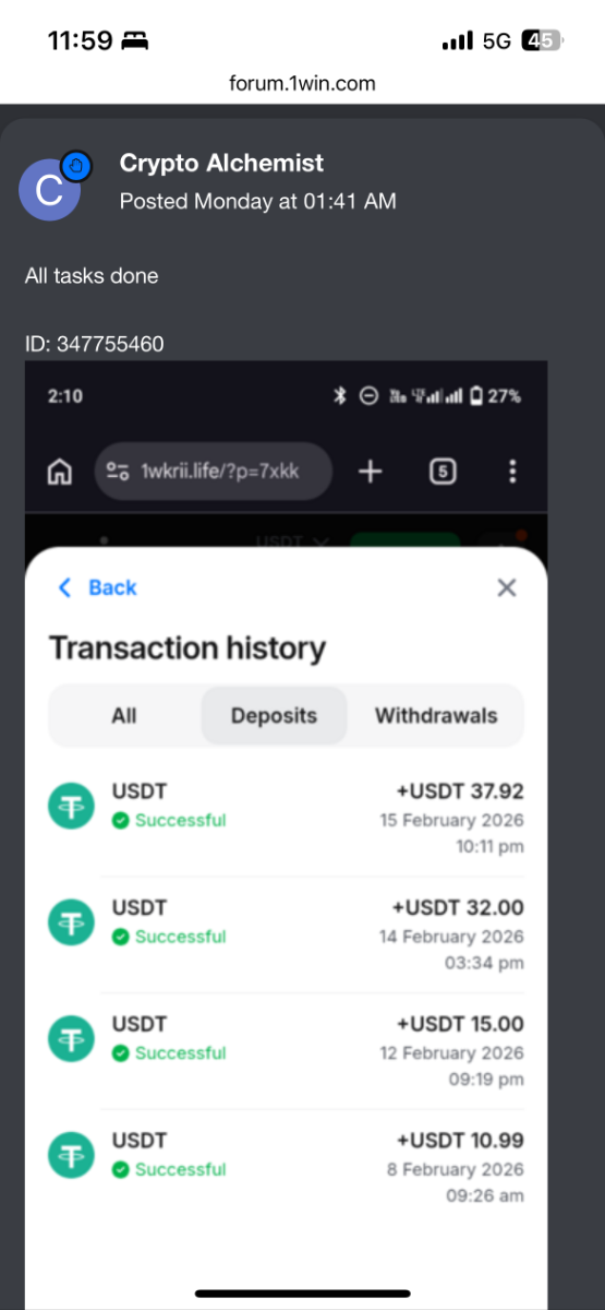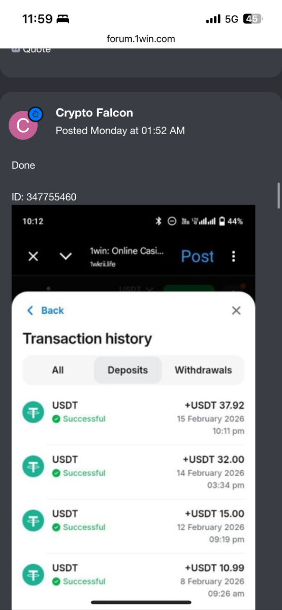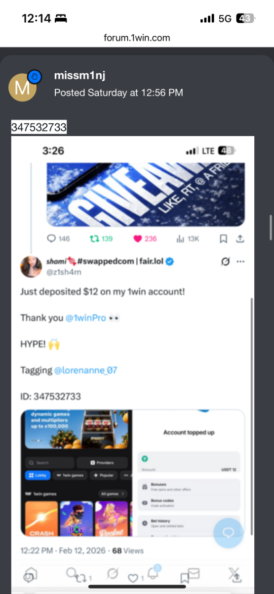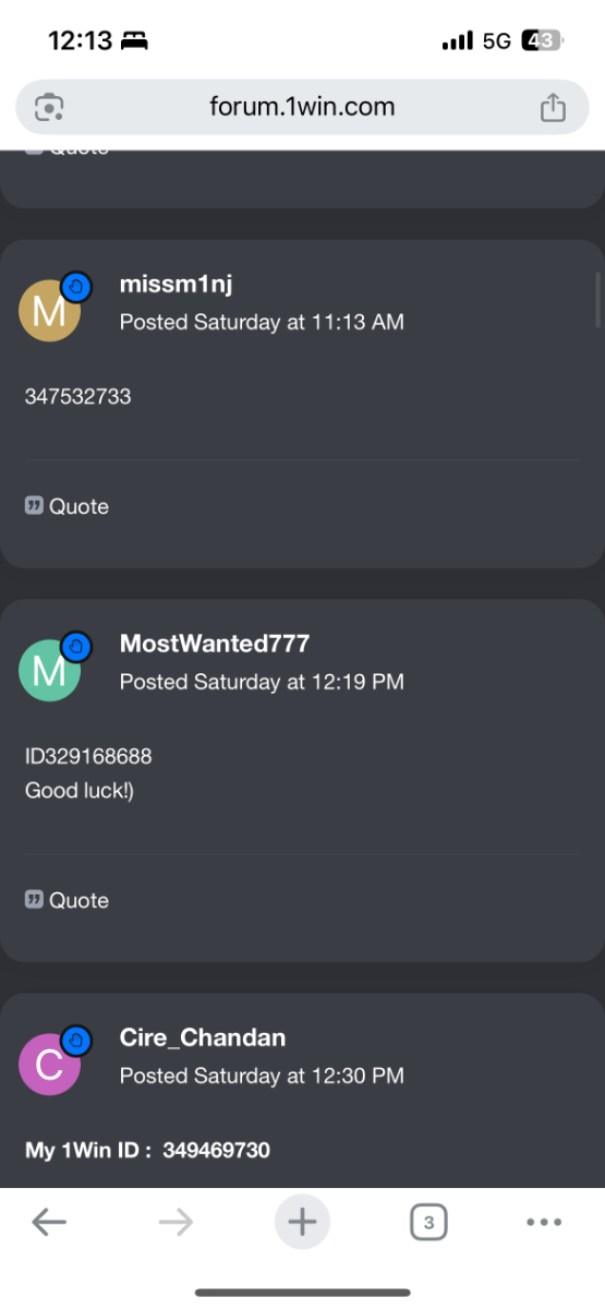 786 Posted 3 hours ago 786 Posted 3 hours ago Important Notesย โ ๏ธ Only crypto deposits qualify. Minimum deposit: $10 during the contest period. One entry per user. Duplicate IDs or multiple comments will be disqualified. Please double-check your 1win ID before posting. Please consider this rule @Ilya Osipovย @Nikita 1win Link to comment https://forum.1wzdib.com/topic/914-5000-giveaway-week-4-results-%F0%9F%8F%86/#findComment-9903 Share on other sites More sharing options...